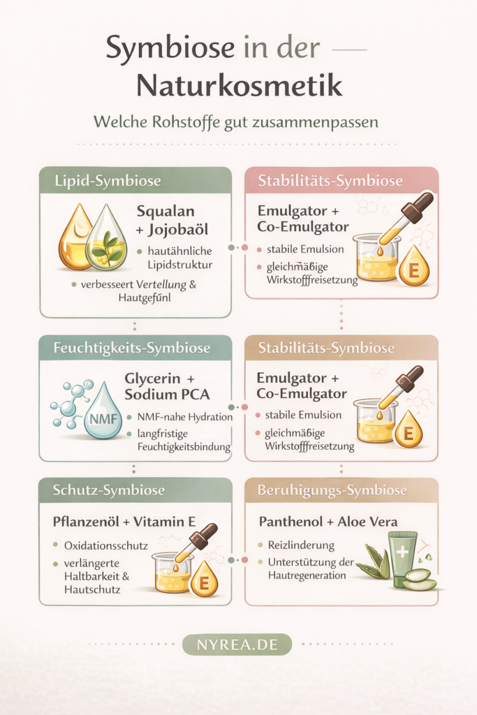 Eine hochwertige Naturkosmetik-Rezeptur funktioniert ähnlich wie ein fein austariertes System: Jeder Bestandteil erfüllt eine klare Aufgabe – und erst im Zusammenspiel entsteht eine stimmige, hautfreundliche Gesamtformulierung.